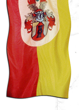 Die Farben und der Eisenhut sind dem Oettingen-Wallersteinschen Wappen entnommen. Das Mühleisen weist auf den Beruf des Müllers hin, der seit über sechs Jahrhunderten bis heute in der Großfamilie noch ausgeübt wird. Die Hopfendolde ist redender Hinweis auf die Herkunft unseres Namens.